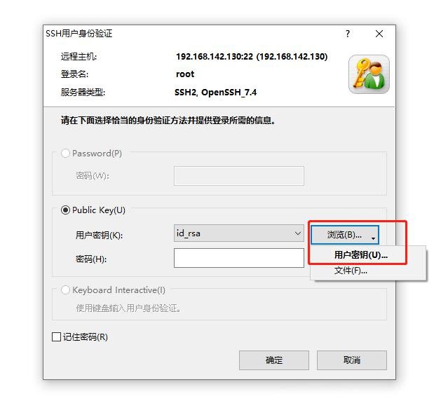 现在你使用你的公钥来登录服务器了,这里以Xshll举例,点击链接服务器之后,会弹出认证窗口(我关闭了密码登录所以密码选项是灰色的)。点击 [浏览] > [用户秘钥] ,在弹出的界面点击 [导入],选择你之前生成的秘钥对中的私钥(是私钥不要选错了),如果在生成秘钥的时候设置了密码在导入时也需要输入密码。