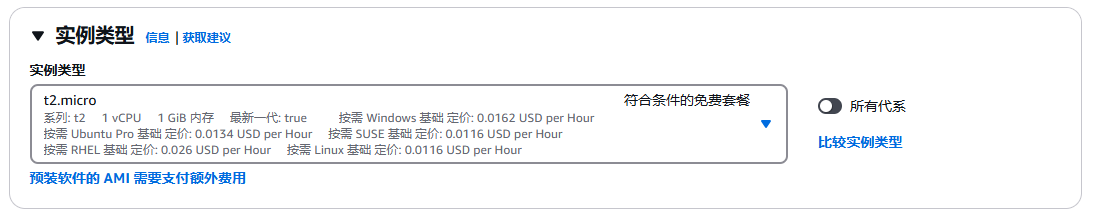 - 勾选 t2.micro 或 **t3.micro**(1核1G,确保显示 **“Free tier eligible”**)。