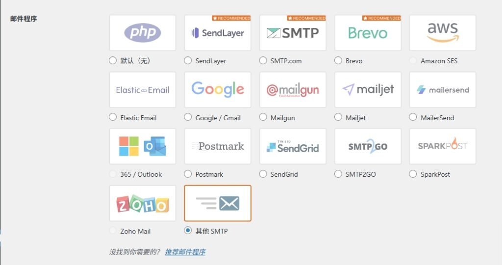 - 选择邮件发送方式:在“邮件服务(Mailer)”或“邮件程序”部分选择 “其他 SMTP”。如果你使用专用的邮件服务(例如 Gmail、Sendinblue、Mailgun 等),则选择对应项并按照向导填写 API 密钥;本文以其他 SMTP 为例。