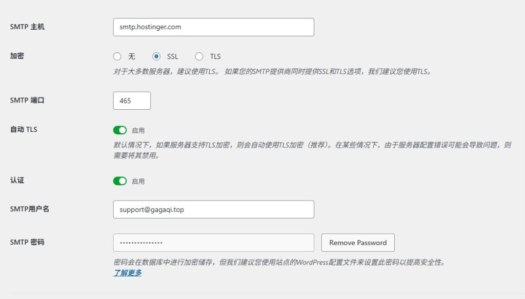 WP Mail SMTP 的作用是通过可靠的 SMTP 服务发送 WordPress 站点邮件(例如联系表单通知和找回密码邮件)。下面以配置 Hostinger 邮箱的 SMTP 为例,其他邮件服务配置方法类似: